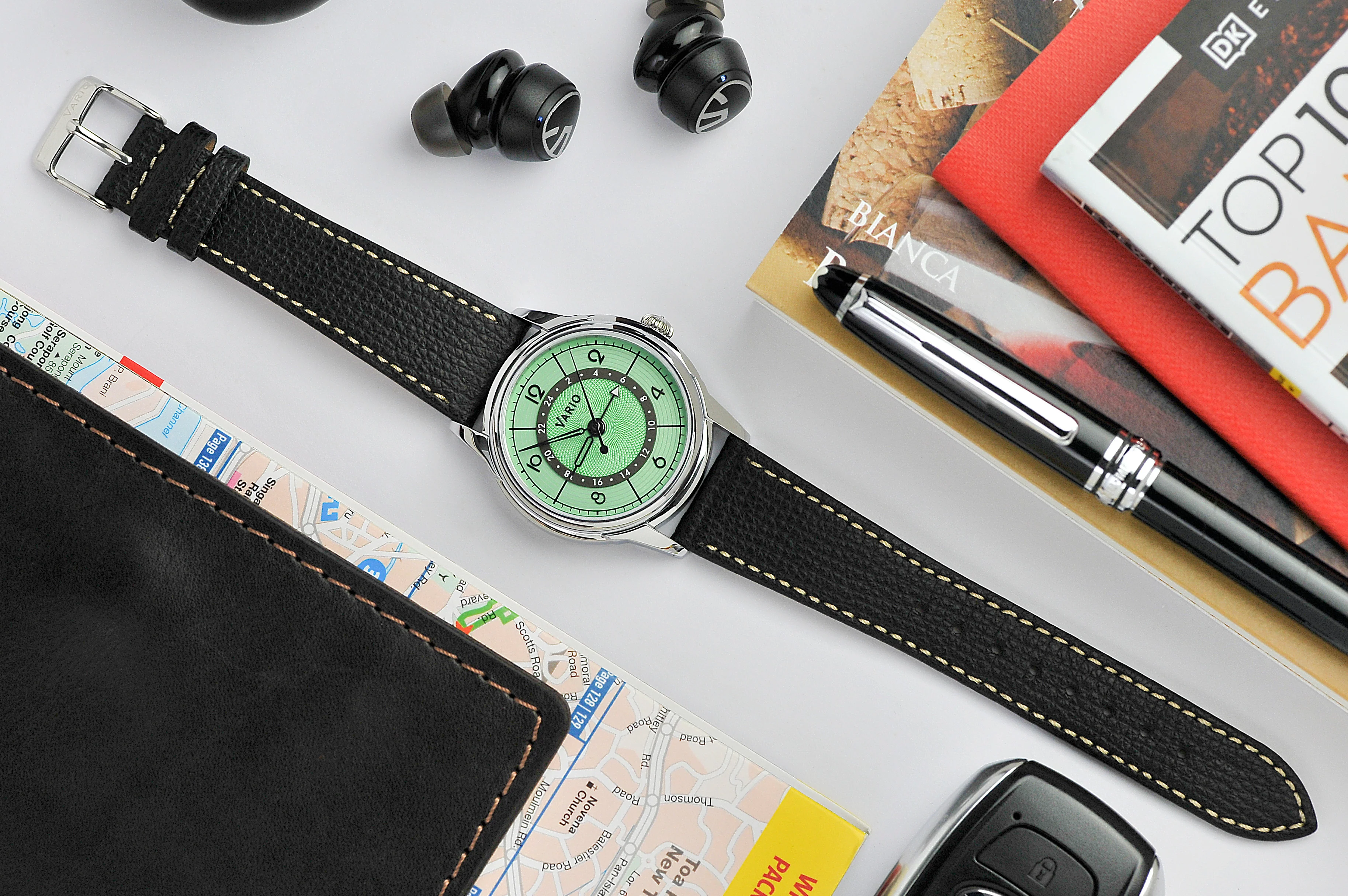 Vario Empire is your gateway to one of the greatest periods in Art Deco design. Each thoughtfully-designed Traveller's GMT watch, made entirely of custom parts, houses your Miyota 9075 True GMT automatic movement and conforms to your wrist with its soft and supple Italian leather strap straight out of the box.